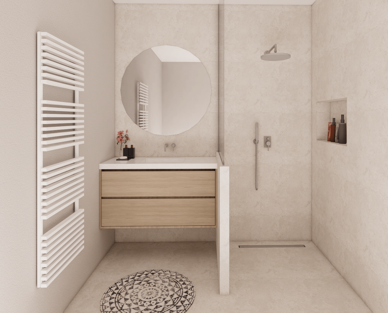Voor een klant uit Baarlo mocht ik een ontwerp maken voor de badkamer, deze wilde ze namelijk gaan veranderen. Het bad mocht ruimte maken voor een inloopdouche en het geheel moest zorgen voor een rustige en nette sfeer.