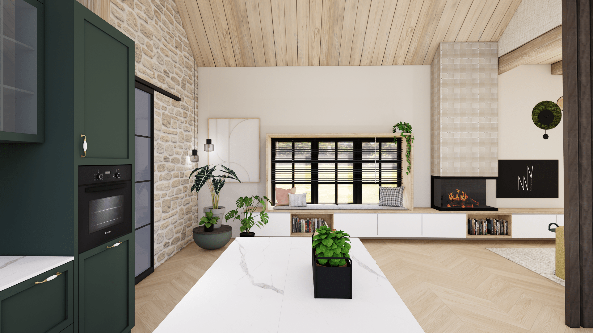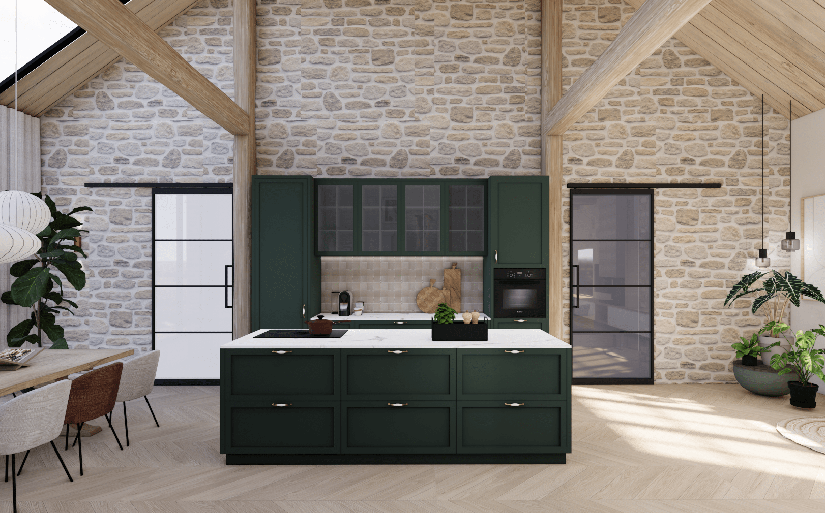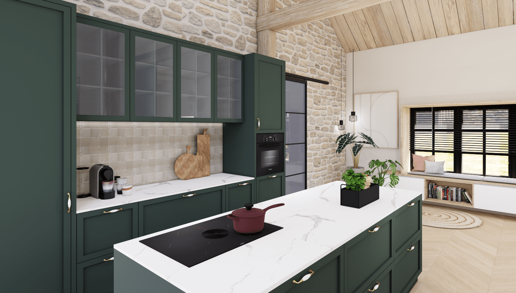 De donkergroene keukenkasten gecombineerd met natuurlijke materialen en warme/aardse accenten en lichte tinten zorgen voor balans, rust en een gezellige sfeer.