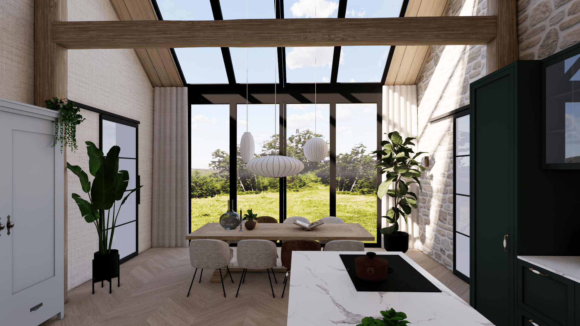 Door het vele glaswerk is er veel natuurlijk licht en tegelijkertijd een prachtige verbinding ontstaan met binnen en buiten. Door o.a. de houten plafonds, balken en stenen muur is het karakter van de boerderij behouden gebleven, en heeft het een modern jasje gekregen.